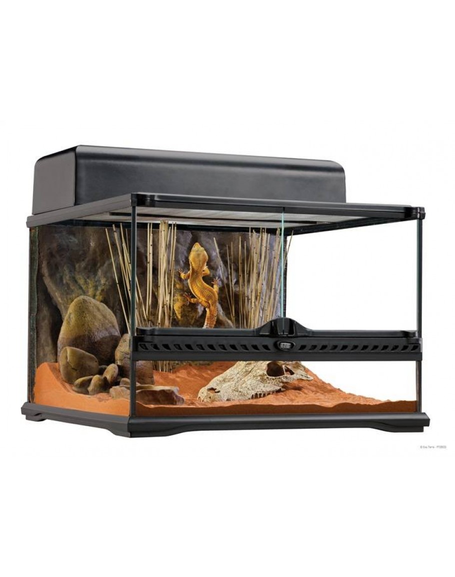 The Exo Terra Glass Terrarium is the ideal reptile or amphibian housing designed by European herpetologists. The front opening doors allow easy access for maintenance and feeding. A specially designed lock will prevent escape and the doors can be opened separately. The full screen top ventilation allows UVB and infrared penetration, and is completely removable for easy access while decorating or cleaning. In the back of the screen cover are 5 closable wire or tube inlets on both sides to install Heat Wave Rocks, Waterfalls, sensors, etc. inside the terrarium. The bottom plate of the terrarium is raised to mount a substrate heater to heat a part of the extended ground surface. The extra high fixed front window is ideal for thick layers of substrates (burrowing reptiles), aquatic parts (paludarium) or to mount an Exo Terra Reptile Den. The natural background has the same color as many other Exo Terra decoration items (Water Dishes, Waterfalls, Heat Wave Rocks, etc.) and provides an extra climbing dimension.