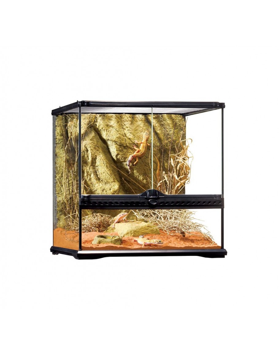 The Exo Terra Glass Terrarium is the ideal reptile or amphibian housing designed by European herpetologists. The front opening doors allow easy access for maintenance and feeding. A specially designed lock will prevent escape and the doors can be opened separately. The full screen top ventilation allows UVB and infrared penetration, and is completely removable for easy access while decorating or cleaning. In the back of the screen cover are 5 closable wire or tube inlets on both sides to install Heat Wave Rocks, Waterfalls, sensors, etc. inside the terrarium. The bottom plate of the terrarium is raised to mount a substrate heater to heat a part of the extended ground surface. The extra high fixed front window is ideal for thick layers of substrates (burrowing reptiles), aquatic parts (paludarium) or to mount an Exo Terra Reptile Den. The natural background has the same color as many other Exo Terra decoration items (Water Dishes, Waterfalls, Heat Wave Rocks, etc.) and provides an extra climbing dimension.