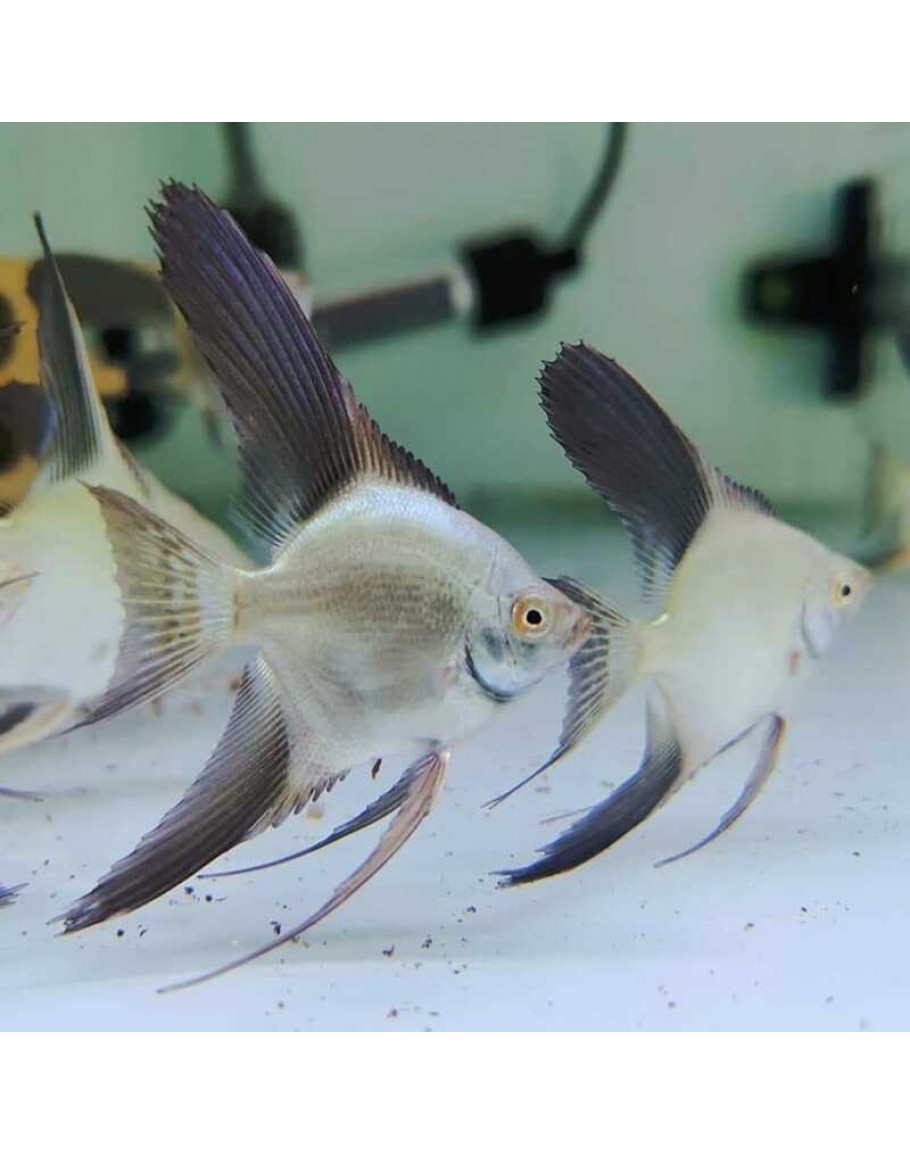 Bulgarian Green Angelfish (Pterophyllum scalare) are fairly new to the hobby, only appearing in the last 7-8 years in the US, and only in rare cases and short supply. They have platinum bodies with a green hue over the scales, but the true beauty is in the dorsal and anal fins. Both fins turn emerald green and create an amazing fish that stands out from all other Angels.They have been called "Bulgarian Seal Point" Angelfish in some circles. Angelfish are easy-going cichlids that do well in almost any community tank. They can tolerate a wide range of pH values and are peaceful enough to be kept with most tetras and other peaceful cichlids.