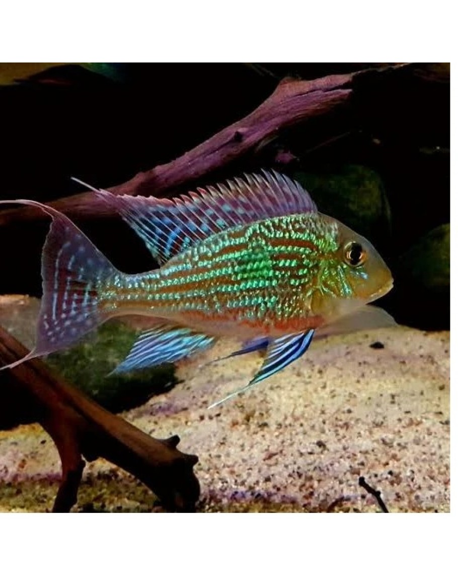 A spectacularly colored eartheater found only in a few river systems in Southern Brazil, the Sveni Eartheater is considered part of the ‘Surinamensis’ complex of closely-related species which are found throughout most of South America. With intense blue, red, and green coloration and long, flowing ventral fin streamers, the variant of Geophagus sveni from Brazil’s Rio Parana is one of, if not the most beautiful and sought after of all eartheaters in the hobby. This species was once an extremely rare import as a wild fish but are now bred on a fairly large scale to supply the hobby worldwide. A relatively peaceful cichlid, the Sveni Eartheater is best kept in groups in an aquarium with fine sand substrate so they can exhibit their natural sand sifting behavior. A varied diet rich in quality proteins and high in red color enhancers like astaxanthin will ensure they develop their most vibrant coloration in the aquarium.