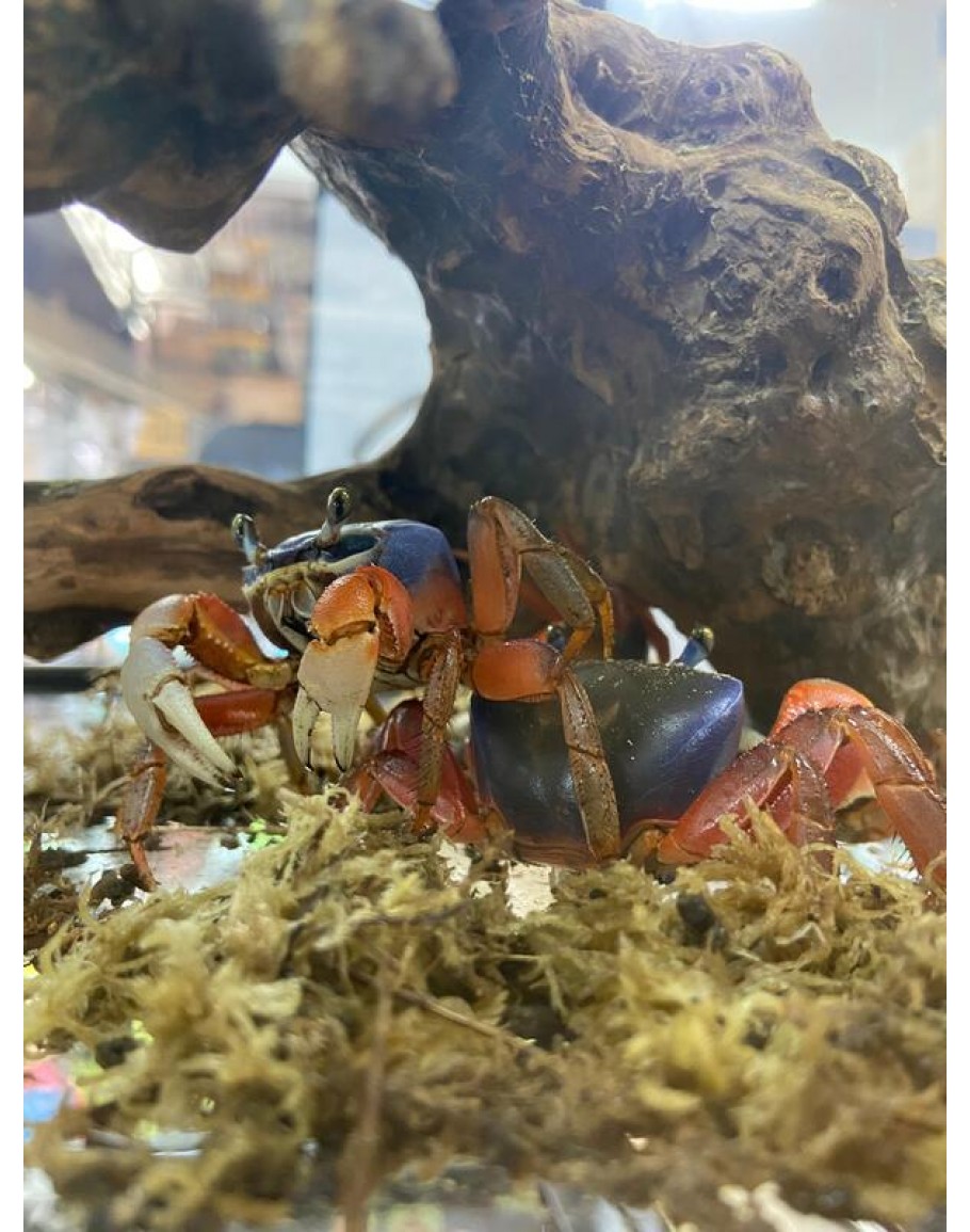 Rainbow crabs, also known as African Rainbow Crab or Patriot Crab, are native to the coastal regions of West Africa. Showcasing stunning colors on their bodies with males featuring bright blue carapace and orange red legs along with white claws while females flaunt pale blue-grey hues combined with pale orange legs coupled by white pincers differentiates them from other animals in their natural habitat.