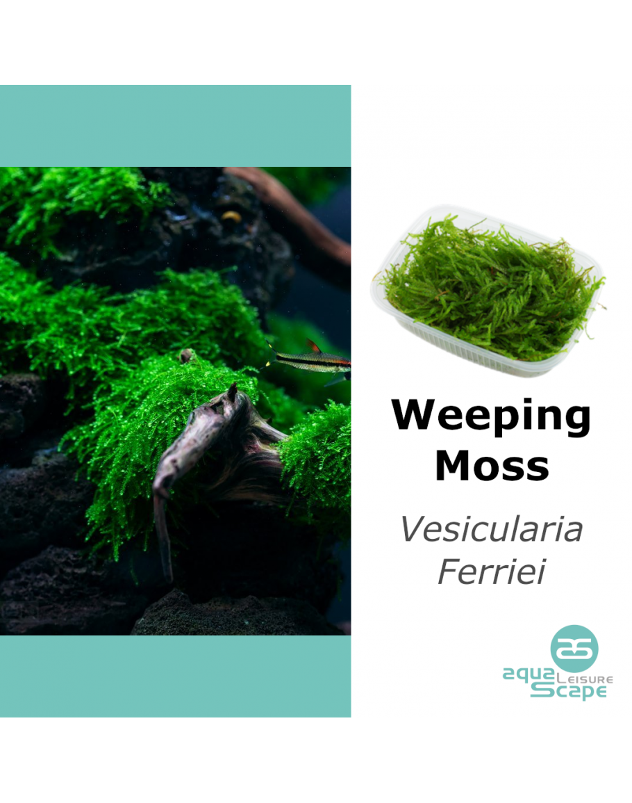 Vesicularia ferriei 'Weeping Moss', commonly known as Weeping Moss, is believed to originate from China and has been distributed by Oriental Aquarium Plants. 'Weeping' is a fleshy, 1-3 cm tall hanging moss with teardrop-like bright green shoots. It is best attached to driftwood or roots, as its drooping growth pattern helps to create depth and contrast in the aquarium. 'Weeping' has low demands, is fast growing and should be pruned frequently with scissors to maintain an attractive shape.