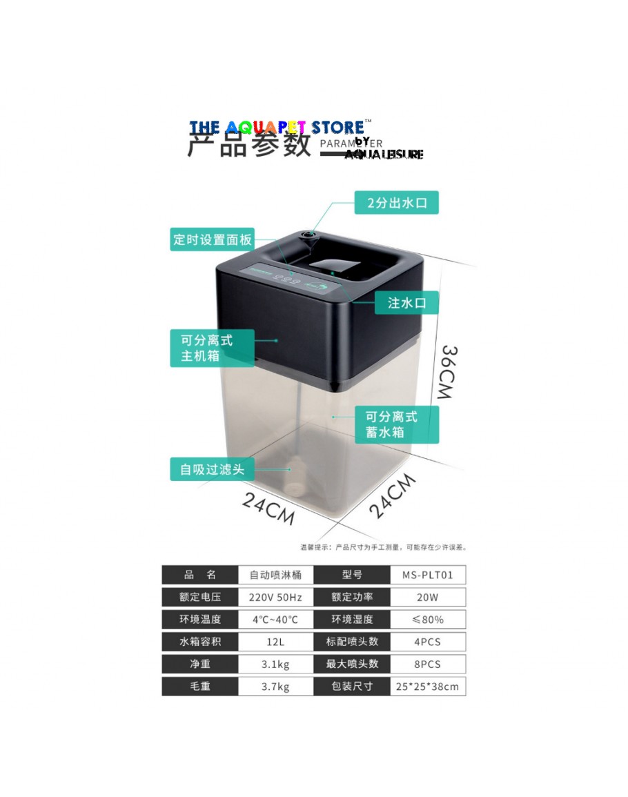 It helps maintain optimal humidity by generating a fine mist at programmed intervals, the duration and frequency of which can be easily adjusted depending on the type of animal or plant housed. Frequent misting helps stimulate breeding behaviour, and is a necessity when housing live tropical plants such as Bromeliads, orchids, mosses, etc.