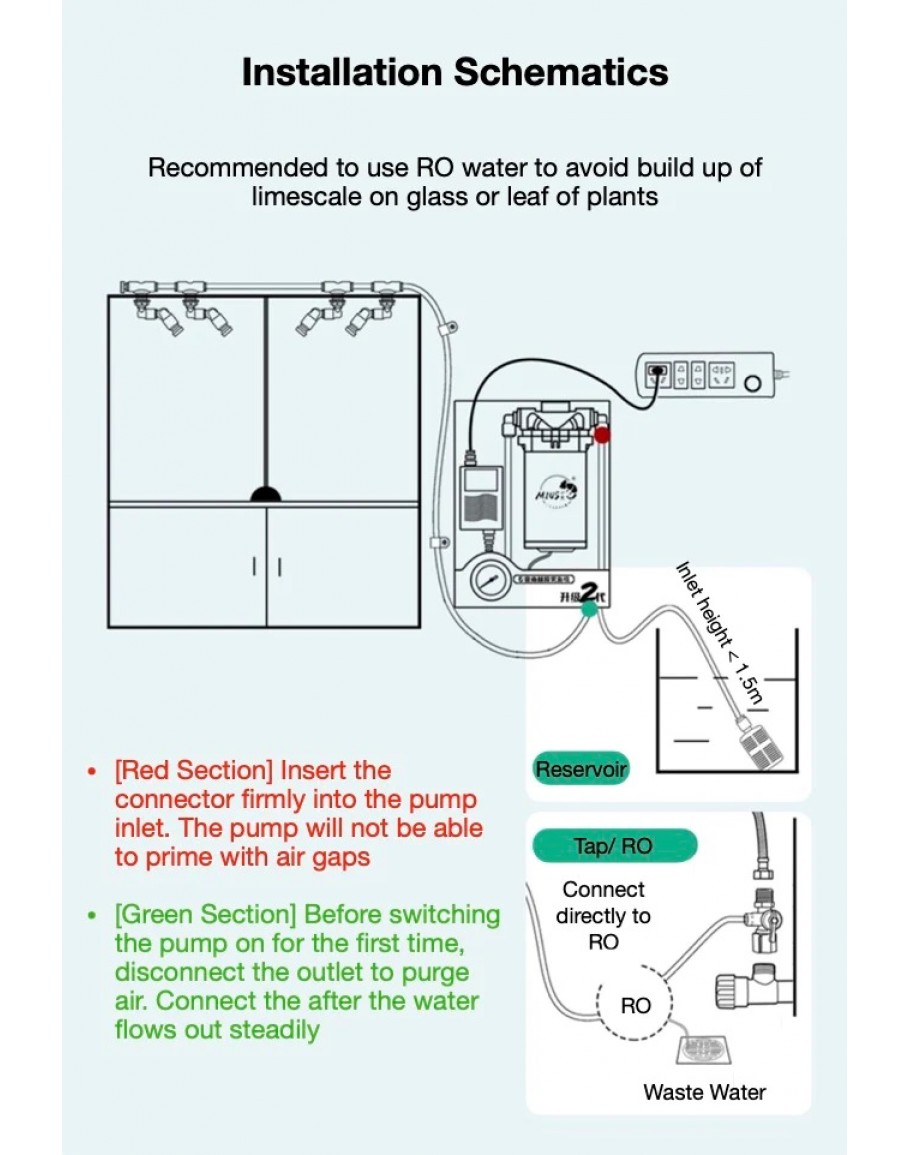 Size: 18.5cm X 7.5cm X 25.2cm Mode: Filter Inlet suction & Connect Tap Water 1) Model: D50 Power: 15W Voltage: 24V Flow rate: 60L/H Nozzle Supports: 1-6 ( normal suction situation) 6-12 ( high pressure situation) Package Contents: 1 x host 1 x PE water pipe (10 meters) 2 x tee 2 x elbow 2 x Hose block 10 x R-shaped clamps 10 x cable ties 1 x Filter Inlet 1 x 3 ways Valve 1 x pipe cutter 1 x Adapter with china 2 pins plug p/s: Nozzles are not included