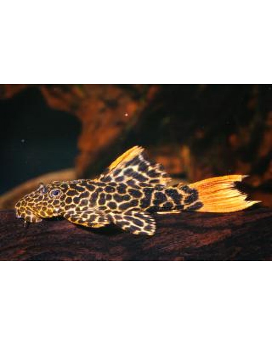 The L600/LDA073 Leopard Cactus Pleco (Pseudacanthicus leopardus) is a member of the Loricariidae family of South American suckermouth catfishes. This omnivorous species is known for its "spiny" odontodes reticulated body pattern, and the bold orange coloration of its dorsal fin and tail. It can grow to a rather impressive size, but not so large that it will outgrow a reasonably large aquarium.