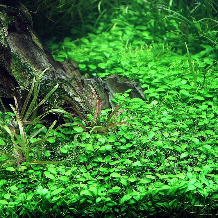 Glossostigma elatinoides from New Zealand is much in demand in Japanese-inspired aquariums. It is one of the smallest aquarium plants (2-3 cm tall), and thus a good foreground plant. A difficult plant demanding a lot of light. Grows upwards if light is poor. Make sure larger plants do not overshadow it. When planting in the aquarium small clumps (approx. 1/8 pot) should be placed at intervals of a few centimetres to help the plants grow together more quickly. CO2 addition and soft water promote growth significantly.